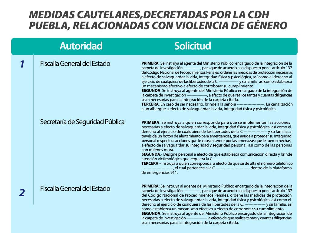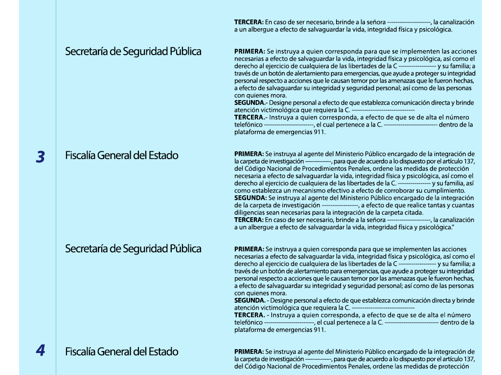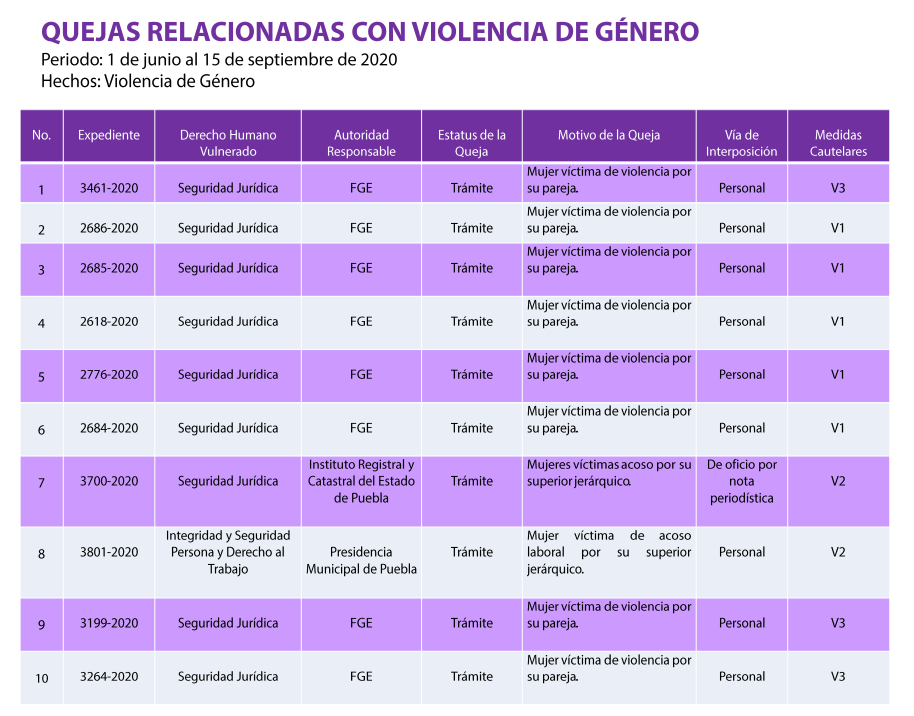 | 3 | 3984-2020 | Derecho a la seguridad jurídica | Físcalia General del Estado | En trámite | Mujeres víctimas de violencia por parte de sus parejas | Oficio | No |
